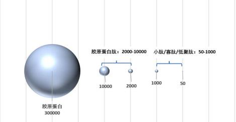 在经过酶解和热水解处理后,胶原蛋白会转化为胶原蛋白肽,从大分子蛋白质转变为小分子胶原蛋白,分子量从300000道尔顿左右变为2000-10000道尔顿左右,这使得胶原蛋白肽比胶原蛋白更易吸收,功效作用更强,目前研究显示,500道尔顿左右分子量的胶原蛋白小肽最适合人体吸收利用。