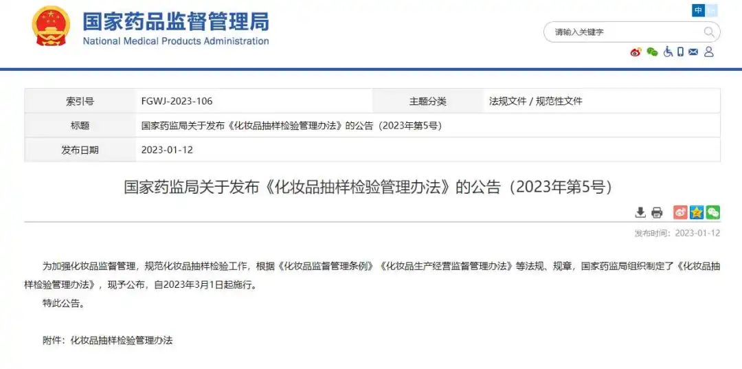 1月12日,国家药监局公布《化妆品抽样检验管理办法》(下称《管理办法》),新规将于2023年3月1日起施行,主要包括抽检计划指定、抽样内容、检验和结果报送、异议和复检等内容。